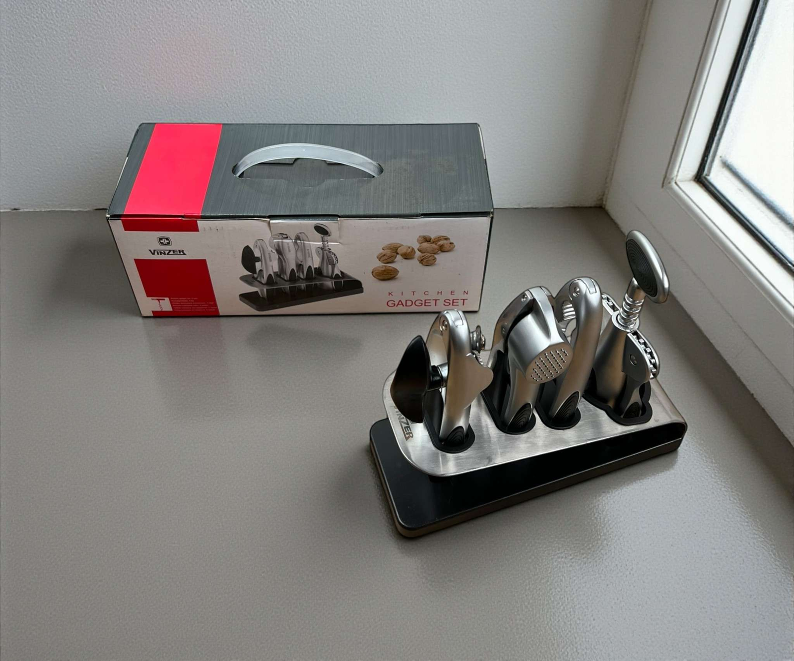 مجموعة أدوات المطبخ، أدوات مطبخ متعددة، فتاح علب، كسارة مكسرات، عصارة ثوم، حامل معدني، أدوات المطبخ الفضية، أدوات المطبخ الحديثة، أدوات المطبخ العراقية