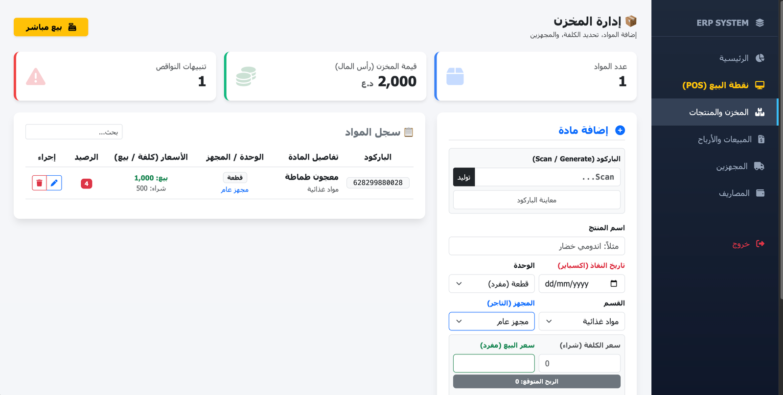 - حاسبة أرباح فورية تظهر الربح المتوقع لكل مادة قبل إضافتها
