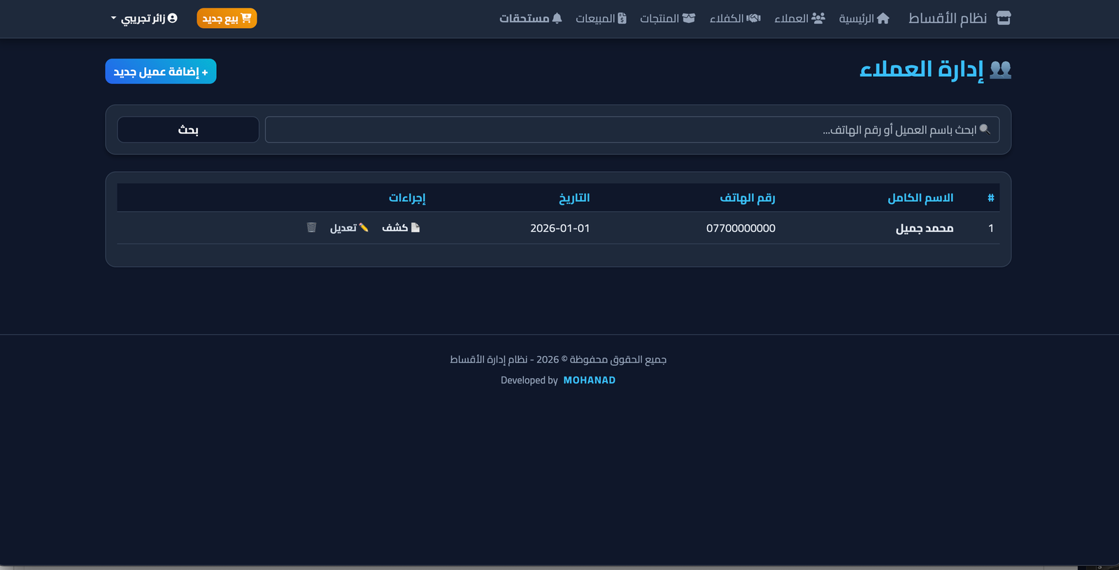 إضافة عميل: تسجيل عميل جديد وربطه بعمليات البيع.
