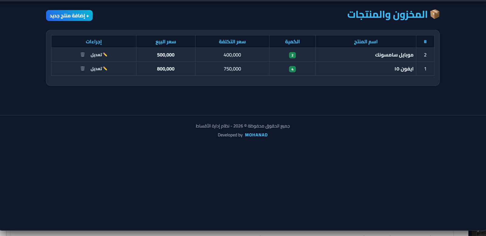 نظام إدارة الأقساط والمبيعات المتكامل هو حل رقمي متكامل صُمم لتنظيم عمليات البيع بالأقساط ومتابعة الديون بشكل احترافي ودقيق 📊. يوفر النظام لوحة تحكم حديثة تعرض ملخصاً فورياً عن الأداء اليومي، إجمالي المبيعات، حالة الأقساط، وعدد العملاء المسجلين 📈.