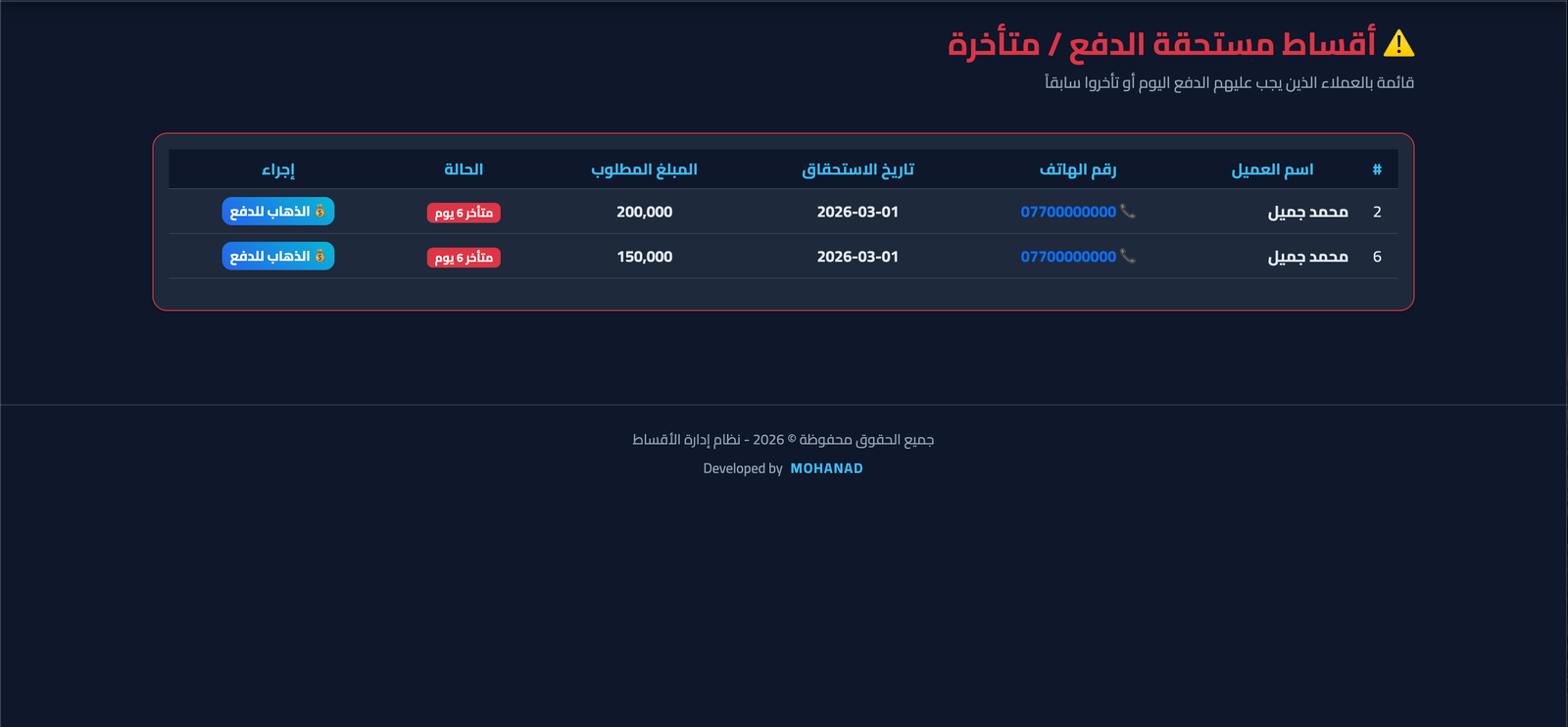 متابعة الديون: عرض الأقساط المستحقة والمتأخرة لكل عميل.