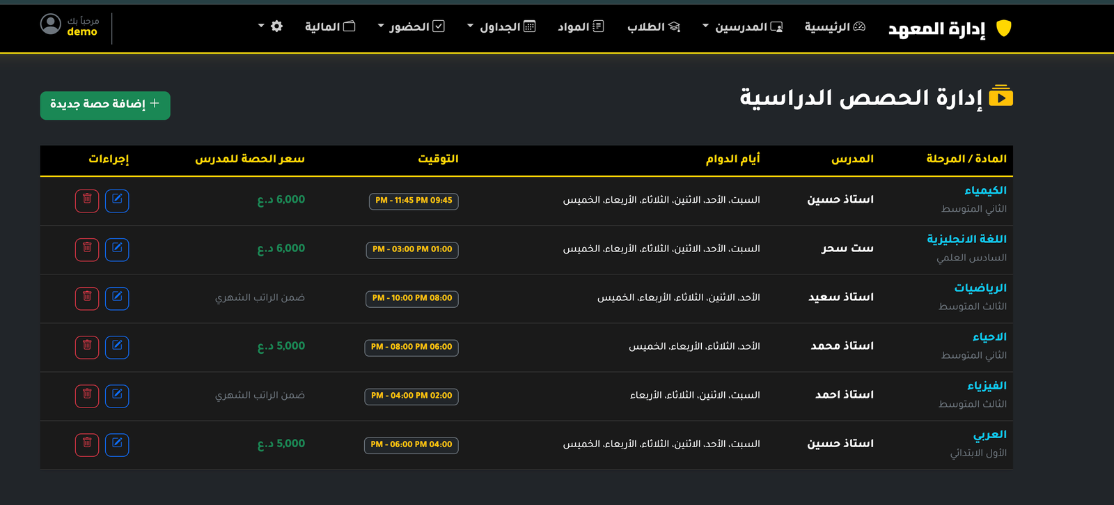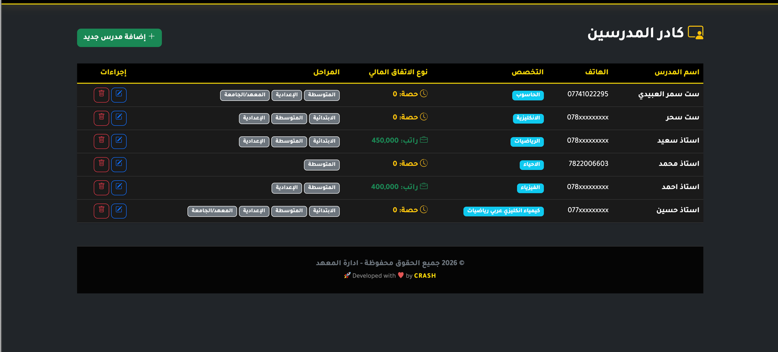 - إدارة المدرسين وربطهم بالمواد والمراحل