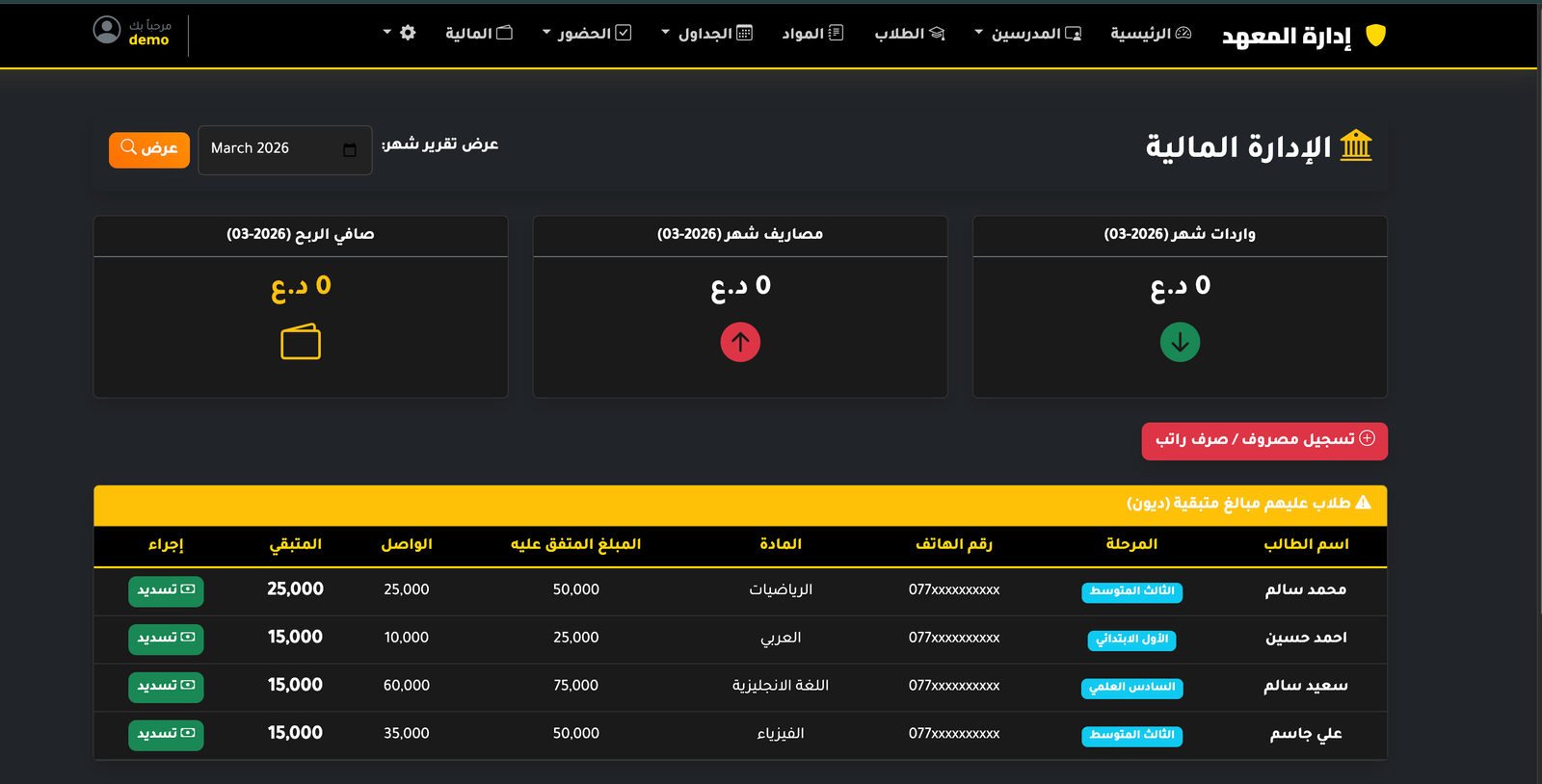 - إدارة الطلبة (تسجيل، متابعة، حالة الطالب)